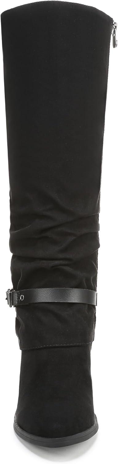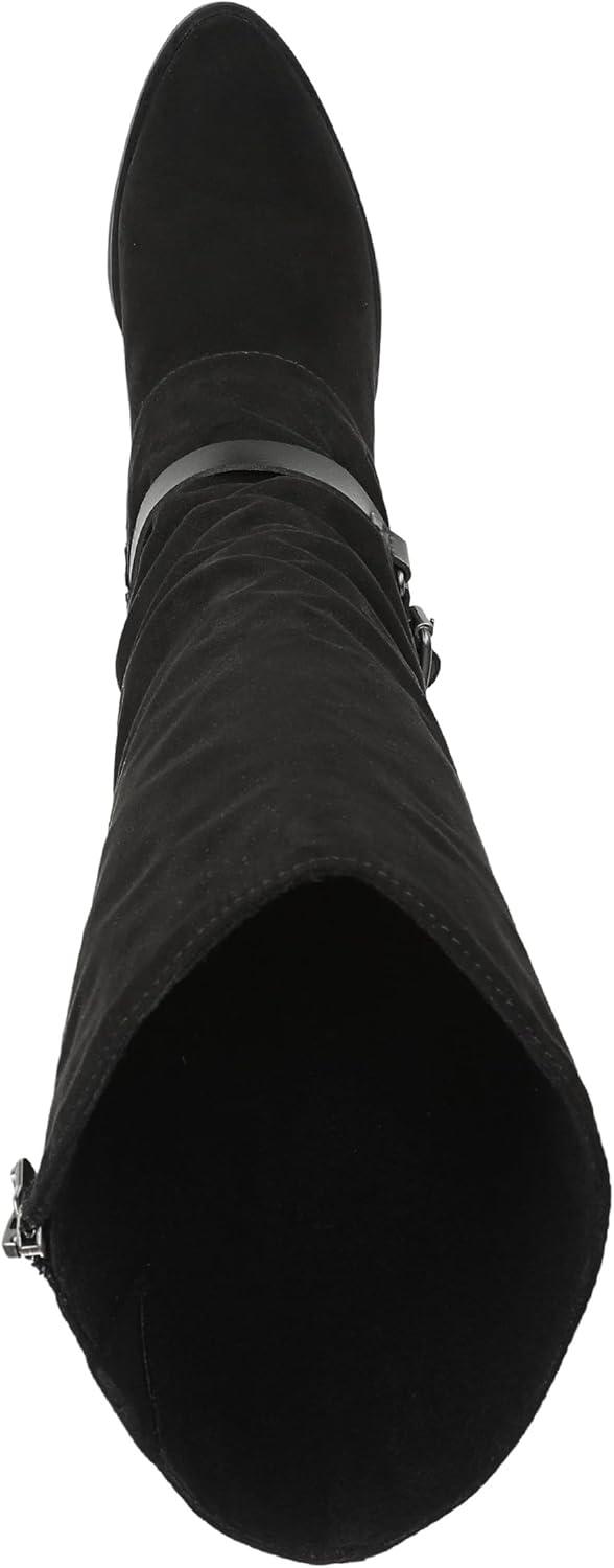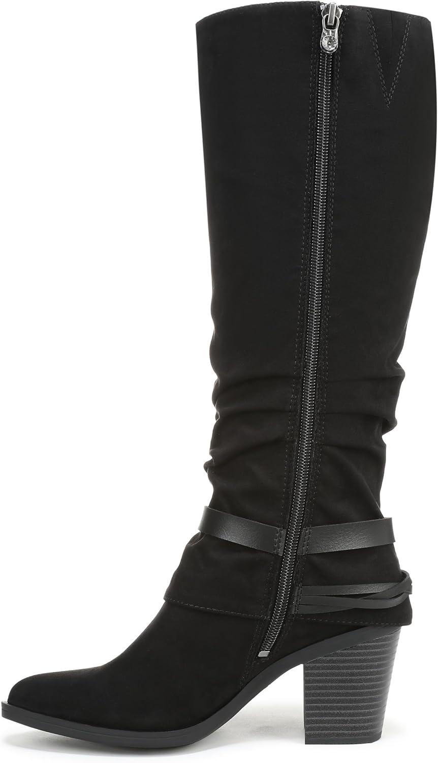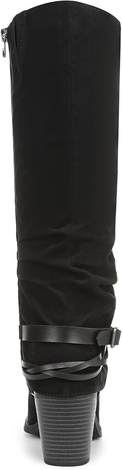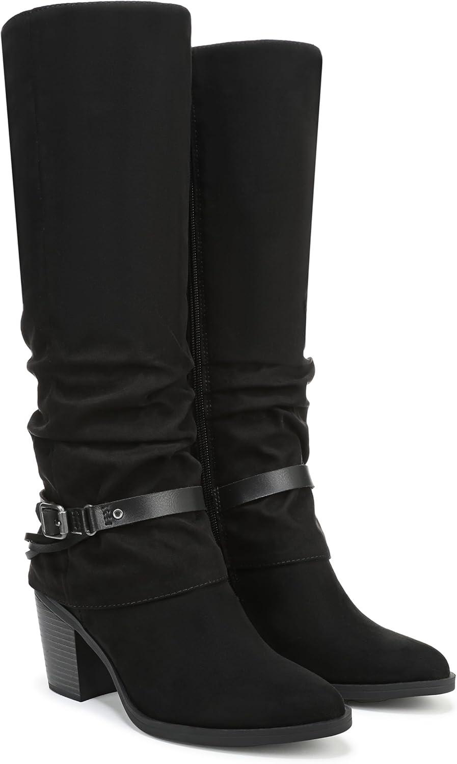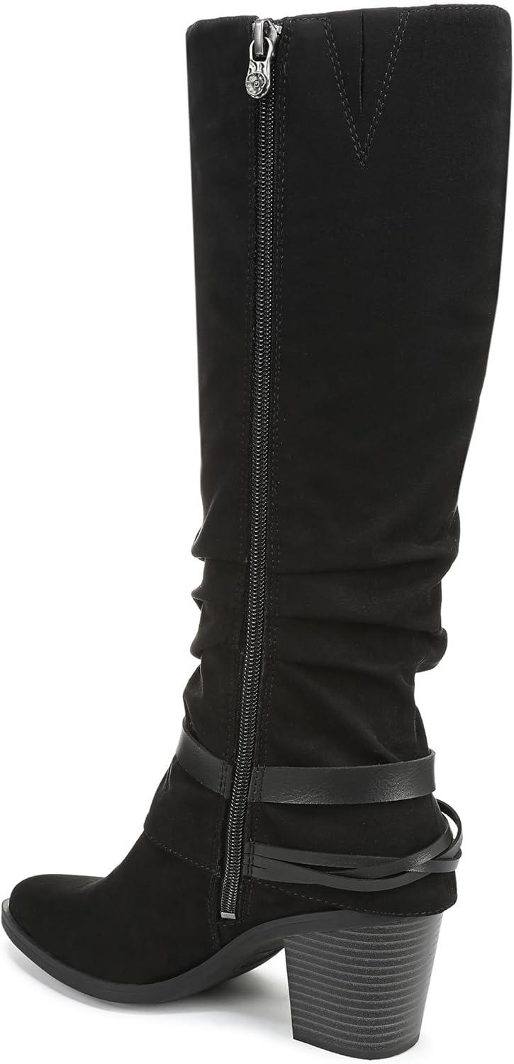 Discover the perfect boho boot with the Carey tall boot from Blowfish Malibu. Features include slouch styling, decorative straps, and a block heel. VEGAN. Microsuede fabric upper. Inside zipper. Almond toe toe. 14 inch boot shaft height, 15.5 inch calf circumference. 3 inch block heel.