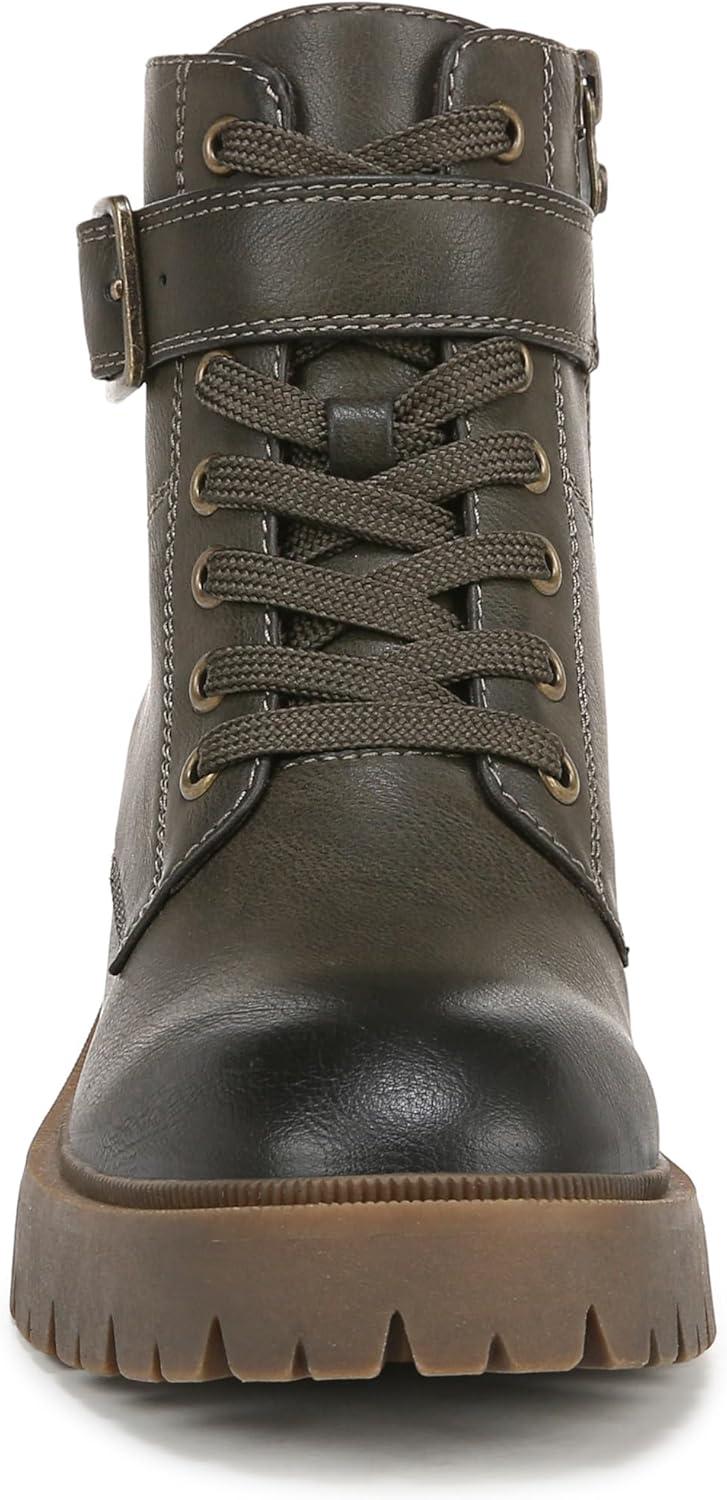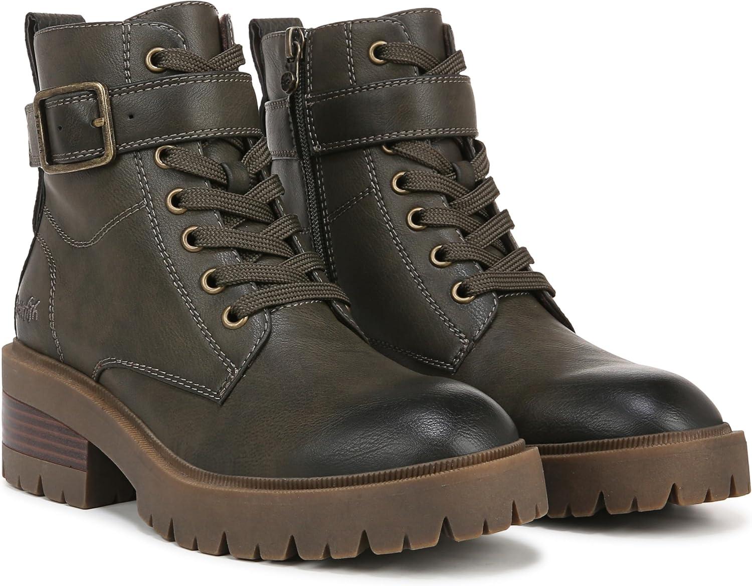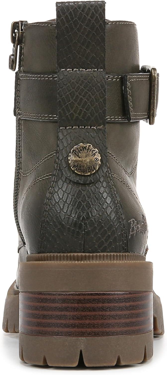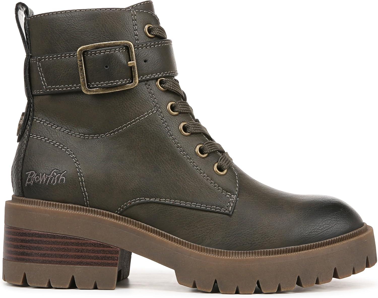 Add some edge to your look with the Jagger Lug Sole Boot from Blowfish Malibu. Features include a moto-inspired sihlouette with a lace-up front, ankle strap with decorative buckle and aggressive lug outsole. VEGAN. Faux-leather upper. Side zipper entry. Lace-up front, decorative metal buckle. 4.9 inch shaft height, 10.25 inch shaft circumference. Lug platform sole with 2 inch stacked heel.