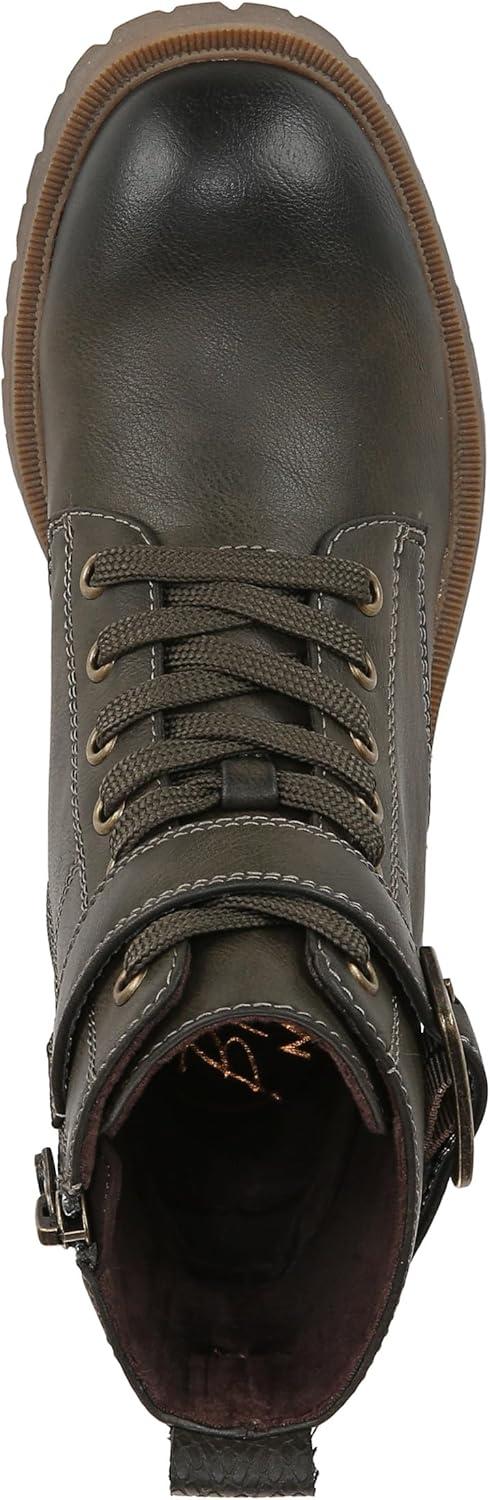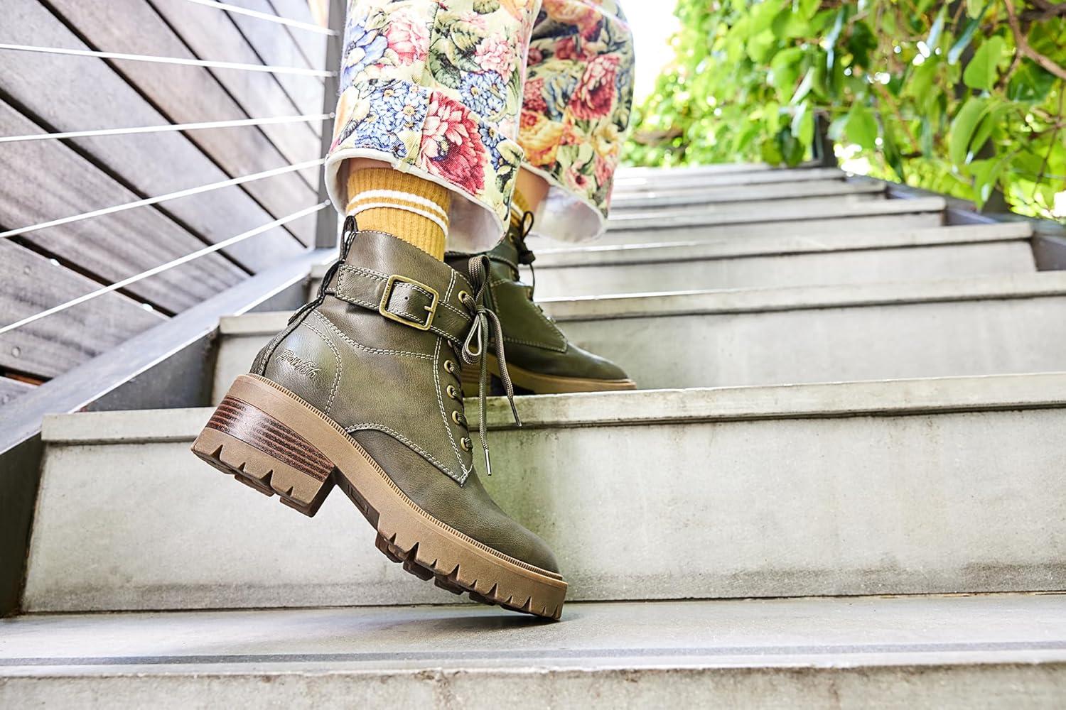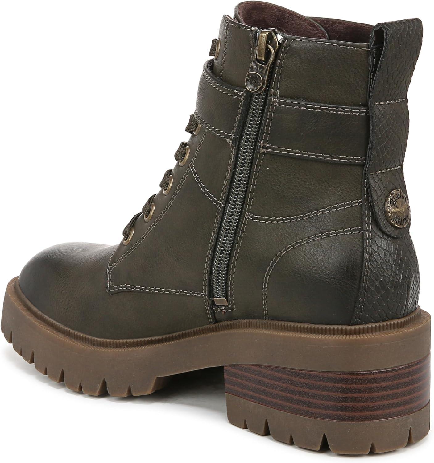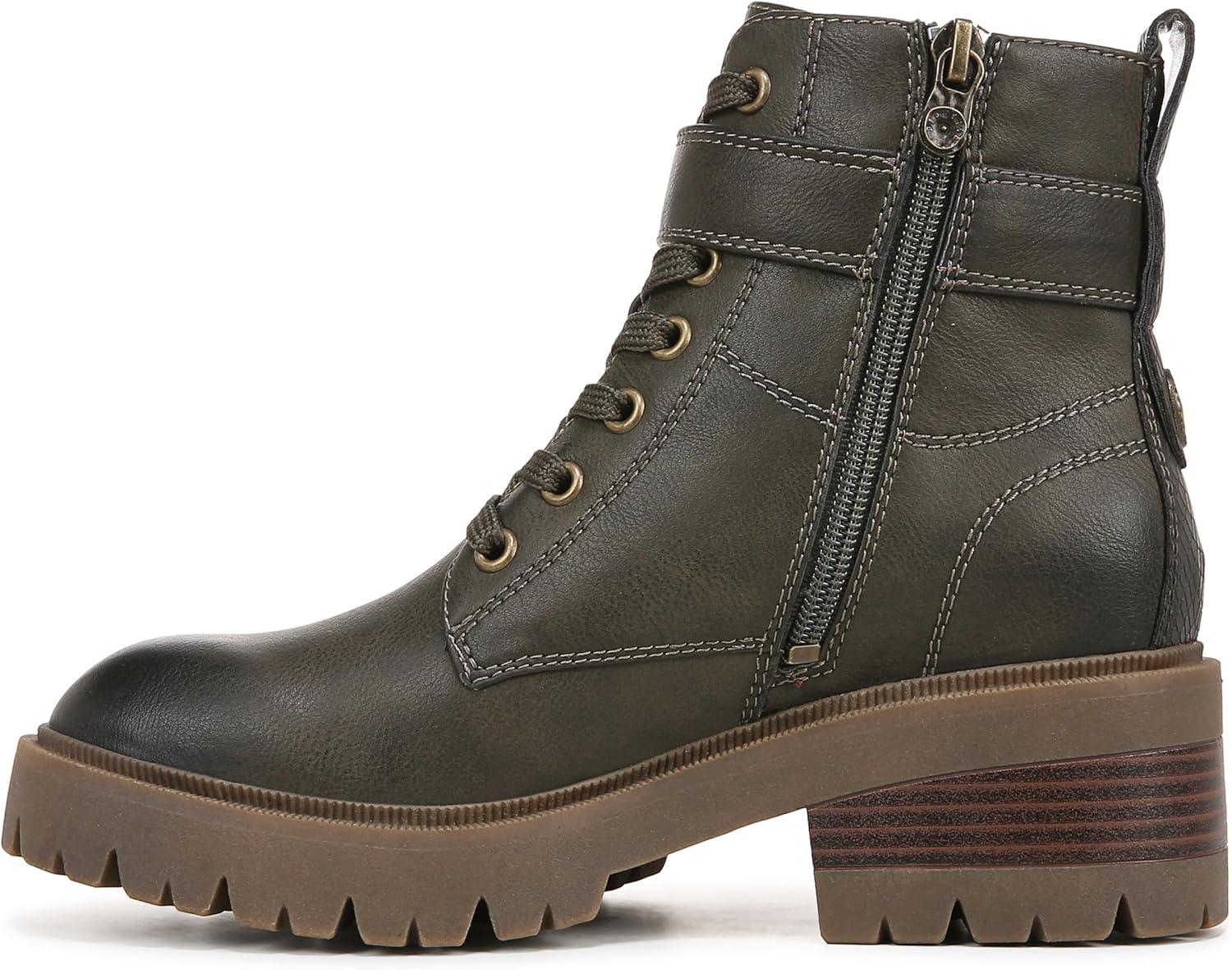 Add some edge to your look with the Jagger Lug Sole Boot from Blowfish Malibu. Features include a moto-inspired sihlouette with a lace-up front, ankle strap with decorative buckle and aggressive lug outsole. VEGAN. Faux-leather upper. Side zipper entry. Lace-up front, decorative metal buckle. 4.9 inch shaft height, 10.25 inch shaft circumference. Lug platform sole with 2 inch stacked heel.
